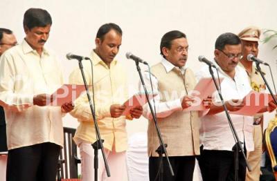 Photo Caption : Governor Vajubhai Vala administering oath to newly selected Ministers Rudrappa Lamani, Santosh Lad, MR Seetaram and SS Mallikarjun as a new Ministers during newly selected Ministers swearing ceremony at Raj Bhavan, in Bengaluru on Sunday 19th June 2016