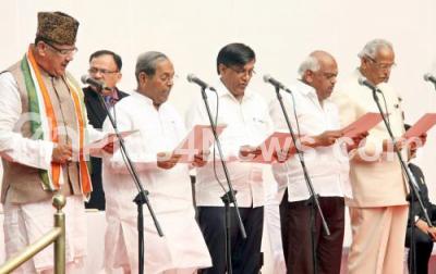 Photo Caption : Governor Vajubhai Vala administering oath to newly selected Ministers Tanveer Sait, HY Meti, Basavaraj Rayareddy, Ramesh Kumar and Kagodu Thimmappa ,during newly selected Ministers swearing in ceremony at Raj Bhavan, in Bengaluru on Sunday 19th June 2016