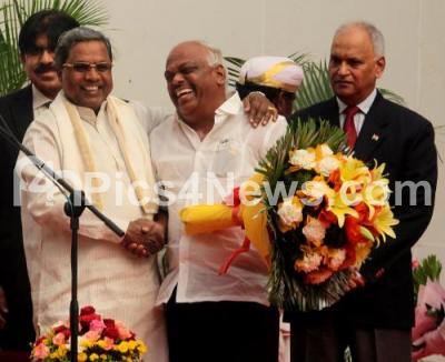 Photo Caption : Newly Selected Minister Ramesh Kumar interacting with CM Siddaramaiah during newly selected Ministers swearing in ceremony at Raj Bhavan, in Bengaluru on Sunday 19th June 2016