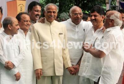 Photo Caption : Newly Selected Ministers Kagodu Thimmappa, Ramesh Kumar interacting with MP Mallikarjuna Kharge and Minister DK Shivakumar, during newly selected Ministers swearing ceremony at Raj Bhavan, , in Bengaluru on Sunday 19th June 2016