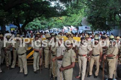 Photo Caption : Police tight security, during newly selected Ministers swearing ceremony at Raj Bhavan, in Bengaluru on Sunday 19th June 2016