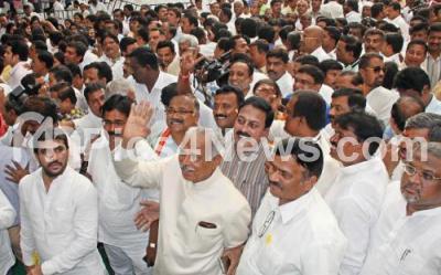 Photo Caption : Newly selected Minister Kagodu Thimmappa seen with the crowd during the newly selected Ministers swearing ceremony at Raj Bhavan, in Bengaluru on Sunday 19th June 2016
