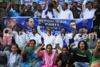 Members of Republican Party of India staged a protest against the Sadashivanagar Police Station In Charge AK Thimmaiah for illegal activities and demamded for his suspension, the protest was held in front of DGP office, in Bengaluru on Monday 20th June 2016