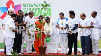Photo Caption : CM Siddaramaiah with Ministers UT Khader, DK Shivakumar, Union Ministers Anantkumar, DV Sadananda Gowda and Sri Vachananda Swamiji and others inaugurating the International Yoga Day, organized by Govt of Karnataka at Kanteerava Stadium , in Bengaluru on Tuesday 21st June 2016