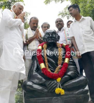 Photo Caption : Minister Kagodu Thimmappa garlanding the statue of Mahatma Gandhi statue at Anand Rao Circle before assuming office as a Minister, in Bengaluru on Wednesday 22nd June 2016
