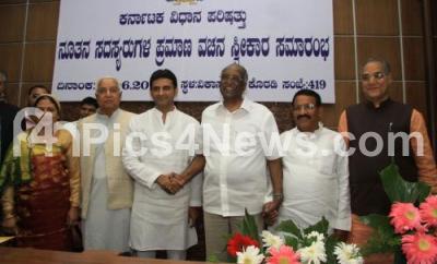 New MLCs Veena Achaiah, Rizwan Arshad, Allam Veerabhadrappa, RB Thimmapur and Lehar Singh being greeted by DH Shankar Murthy, Council Chairman after taking oath as MLCs during the swearing in Ceremony as MLC at Vikas Soudha, in Bengaluru on Wednesday 22nd June 2016