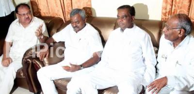 Photo Caption : Congress MLAs V Srinivas Prasad and and Qamarul Islam, who were recently shunted out of their ministership, holding meeting with another MLAs Malka Reddy and ST Somashekar at residence of Srinivas Prasad , in Bengaluru on Wednesday 22nd June 2016