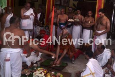 Photo Caption : Yaduveer Krishnadatta Chamaraja Wadiyar performs pada puja to Parakala Swamiji as part of his wedding rituals with Trishikha Kumari slated for June 27 at the Mysore Palace, in Mysuru on Saturday 25th June 2016