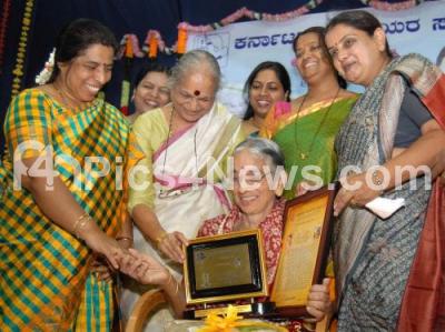 Photo Caption : Anupama award being honored to Writer Ganga Padekal at a programme organized by Karnataka Women Writers Association at Kannada Sahitya Parishat, also seen are Dr Vasundara Bhupati, President, Karnataka Women Writers Association, Asha Hegde, Karnataka Women Writers Association and others, in Bengaluru on Sunday 3rd July 2016