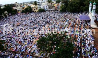 Photo Caption : Muslim people partake in Ramzan prayer at Chamrajpet Eidgah Maidan on the occasion of Ramzan festival, in Bengaluru on Thursday 7th July 2016