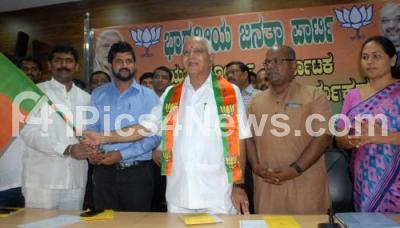 Photo Caption : BJP State President BS Yeddyurappa handing over the BJP flag to BJP Yuva Morcha President MP Pratap Simha at BJP Office, also seen are MP Shobha Karandlaje and others, in Bengaluru on Thursday 7th July 2016