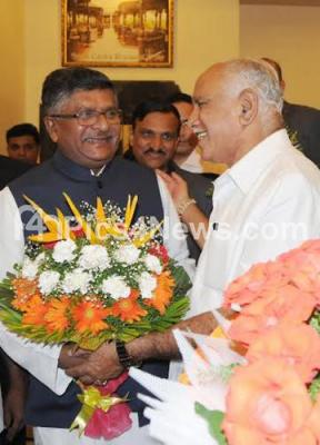 Photo Caption : Ravi Shankar Prasad, Union Minister, Communications and IT and BJP State President BS Yeddyurappa at an interactive meeting on "Challenges and Opportunities" of IT and ITES Startups and SMEs at Hotel Capitol, organsied by BJP Karnataka Economic Cell, in Bengaluru on Thursday 7th July 2016