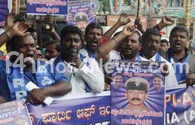 Photo Caption : Members of Republican Party of India seen protesting against the state government for the recent suicide of the DYSP Ganapati, the protest was held at SBM Circle, in Bengaluru on Saturday 9th July 2016