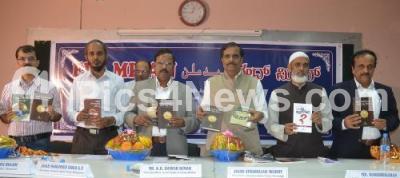 Manu Baligar, President Kannada Sahitya Parishat with Dr Belgami Mohammed Saad, Ravi Hegde and others seen releasing various Kannada Books during the Eid Milan Program at Darussalam, Queens Road , in Bengaluru on Sunday 10th July 2016