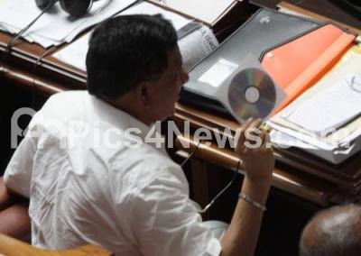 Photo Caption : BJP MLA Bopaiah seen displaying the detailed interview CD of DYSP Ganapati of a private channel, while the opposition were arguing about the DYSP Ganapati suicide case and demanding for the resignation of Minister KJ George during the Assembly Session at Vidhan Soudha, in Bengaluru on Monday 11th July 2016