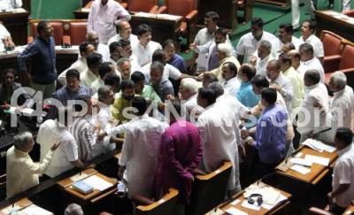 BJP MLAs arguing with Congress Ministers and MLAs during Assembly Session at Vidhana Soudha , in Bengaluru on Tuesday 12th July 2016