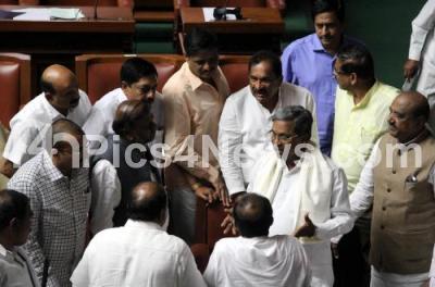 Photo Caption : CM Siddaramaiah discussing with Ministers and MLAs during Assembly Session at Vidhana Soudha , in Bengaluru on Tuesday 12th July 2016
