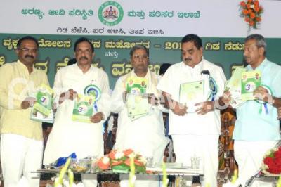 Photo Caption : CM Siddaramaiah with Ministers KJ George, Ramanath Rai, Mayor Manjunath Reddy and MLA Byrati Basavaraj releasing souvenir during Koti Vruksha Andolana at Hennur Lake Park , in Bengaluru on Friday 15th July 2016