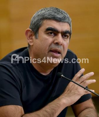 Infosys CEO Vishal Sikka addressing to announce company quarterly financial result at Infosys campus, in Bengaluru on Friday 15th July 2016