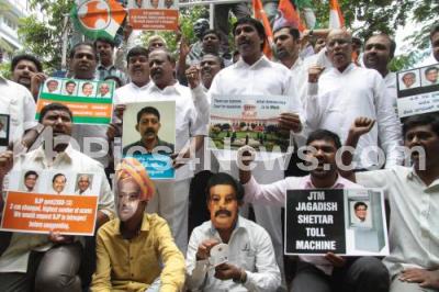 Photo Caption : Members of Indian Youth Congress staged a protest against Karnataka BJP and JDS state leaders for protesting in the DYSP Ganapti case in the Assembly and Council Sessions, the protest was held at Anand Rao Circle, in Bengaluru on Saturday 16th July 2016