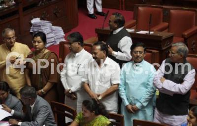 Photo Caption : BJP MLCs KS Eshwarappa, Tara, Lehar Singh and others seen protesting and demanding the resignation of Minister KJ George for his alleged involvement in the suicide of DYSP Ganapati during Council Session at Vidhana Soudha, in Bengaluru on Monday 18th July 2016