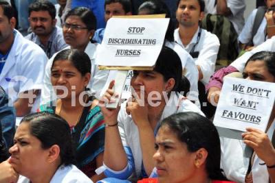 Photo Caption : Members from NIMHANS nurses welfare Association demonstrating against 7th pay commission recommendation in front of Town Hall, in Bengaluru on Wednesday 20th July 2016