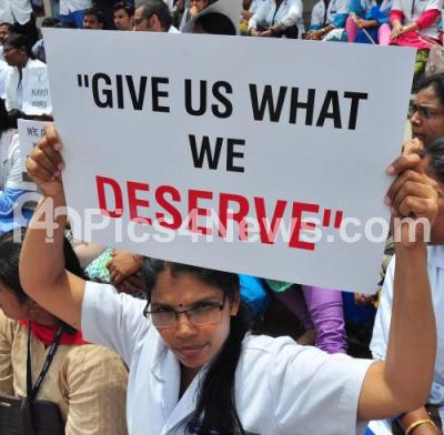 Members from NIMHANS nurses welfare Association demonstrating against 7th pay commission recommendation in front of Town Hall, in Bengaluru on Wednesday 20th July 2016
