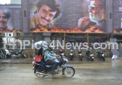 Photo Caption : People seen getting drenched in rain and riding past the huge banners of Rajinikanth upcoming Tamil film Kabali at Urvashi Theatre on Lalbagh Road , in Bengaluru on Wednesday 20th July 2016