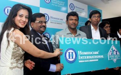 Power Star Puneeth Rajkumar with Actress Harshika Poonaccha and Srikant Morlawar, CMD, Homeocare at the inauguration of Homeocare Clinic at Malleshwaram , in Bengaluru on Sunday 24th July 2016