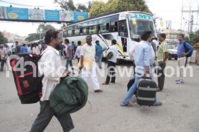 Photo Caption : Passengers had a tough time finding a transport as the normal life was partially hit as the transport services of BMTC, KSRTC were off roads as their employees went on strike for wage hike, majestic and other bus stands were deserted as the busses were not functioning, in Bengaluru on Monday 25th July 2016