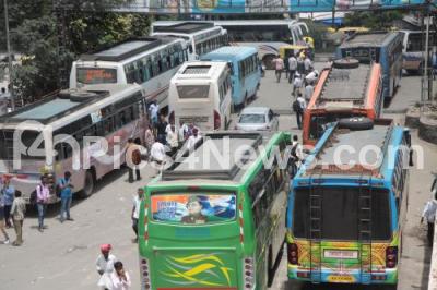 Photo Caption : Private buses had a field day as the transport services of BMTC, KSRTC were off roads as their employees went on strike for wage hike, majestic and other bus stands were deserted as the busses were not functioning, in Bengaluru on Monday 25th July 2016