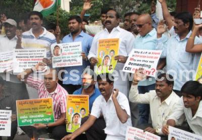 Event Description : Members of Indian Youth Congress seen protesting and demanding for the arrest of Praveen Kandya, a Bajrang Dal activist, involved in the DSP Kallappa Handibag suicide case, the protest was held at Anand Rao Circle, in Bengaluru on Tuesday 26th July 2016