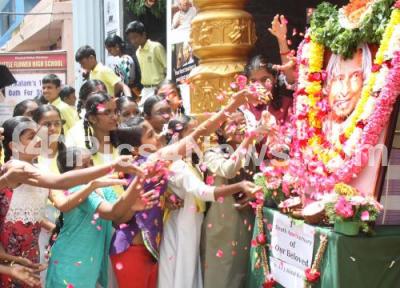 Event Description : Children floral tribute to the portrait of APJ Abdul Kalam, Former President of India, on his 1st Death Anniversary at Srirampura , in Bengaluru on Wednesday 27th July 2016