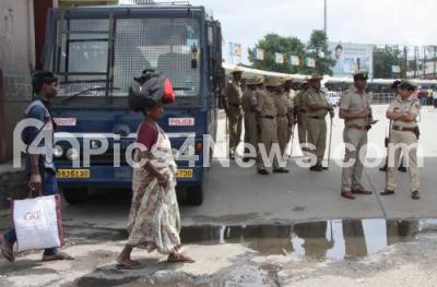 Photo Caption : Tight police vigilance at majestic bus stand as a precautionary measure, as many commuters are stranded at Majestic bus Stand stranded, as the BMTC, KSRTC and others transport unions were on strike on the 3rd day, causing major problems to the daily commuters, in Bengaluru on Wednesday 27th July 2016