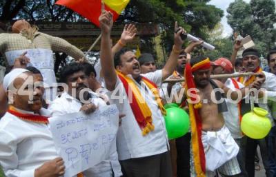 Event Description : Members of Karnataka Rakshana Vedike holding a protest demonstration against verdict on Mahadayi Kalasa Bandoori water projects at SBM Circle , in Bengaluru on Thursday 28th July 2016