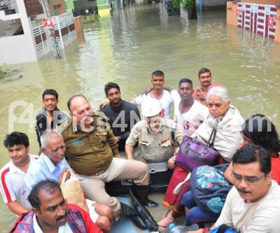 Photo Caption : Fire personnel rescue the stranded residents from their rain flooded houses at Kodichikkanahalli, Bommanahalli, as Benglauru City received incessant rainfall, in Bengaluru on Friday 29th July 2016 Pics: www.pics4news.com