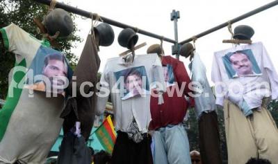 Photo Caption : Kannada and Farmers Association burning the effigy of All party MPs following Pro Kannada organizations and Farmers Associations called for a Karnataka bandh condemning the Mahadayi water dispute tribunal order, rejecting the interim plea of Karnataka seeking permission to utilize 7 tmc ft of water from the Mahadayi River , in Bengaluru on Saturday 30th July 2016