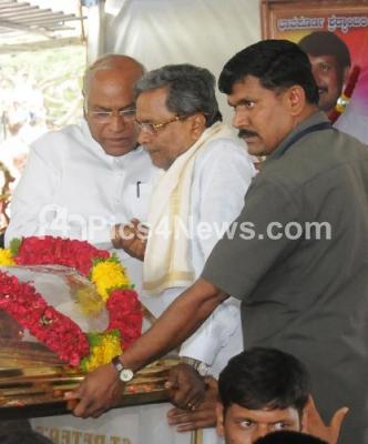 Photo Caption : CM Siddaramaiah being consoled by Mallikarjuna Kharge on the death of Rakesh Siddaramaiah, who died due to multi organ failure at Antwerp University Hospital in Belgium, the body of Rakesh Siddaramaiah was kept for public viewing at the Dasara Expo Grounds in Mysuru, the body arrived in Mysuru by a special flight from Bengaluru, the last rites will be performed at Siddaramaiah farm house at T Katur on the outskirts of Mysuru in the presence of family members, relatives and friends, in Mysuru on Monday 1st August 2016