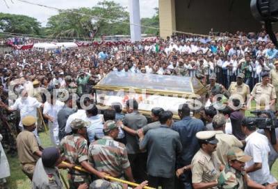 Photo Caption : The body of Rakesh Siddaramaiah, son of CM Siddaramaiah seen arriving for the public viewing in Mysuru, who died due to multi organ failure at Antwerp University Hospital in Belgium, the body of Rakesh Siddaramaiah was Skept for public viewing at the Dasara Expo Grounds in Mysuru, the body arrived in Mysuru by a special flight from Bengaluru, the last rites will be performed at Siddaramaiah farm house at T Katur on the outskirts of Mysuru in the presence of family members, relatives and friends, in Mysuru on Monday 1st August 2016