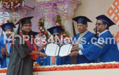 Photo Caption : Governor Vajubhai Rudabhai Vala with Minister Basavaraj Rayareddy, Dr P Shyama Raju and others presenting the graduation certificates to the students during the 1st annual convocation of Reva University at Rukmini Knowledge Park at Reva University, Yelahanka, in Bengaluru on Thursday 4th August 2016
