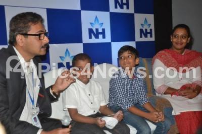 Event Description : 8 year old boy Rihaan (white shirt), who was successfully cured of relapsed leukemia at Narayana Health City with Immunotherapy and Bone Marrow Transplant with the help his donor brother Nihaal, were seen addressing a press conference on treatment of cancer with a step ahead immunotherapy, the press conference was held at ITC Gardenia, in Bengaluru on Friday 5th August 2016