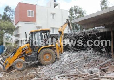 Photo Caption : BBMP on demolition drive of the buildings encroached the Rajakaluve at Shubh enclave at Kasavanahalli off Sarjapur road, in Bengaluru on Sunday 7th August 2016