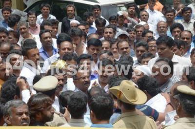 Photo Caption : BBMP Contactors seen with BBMP Mayor Manjunath Reddy at BBMP Head Office, during their protest to clear their bills, in Bengaluru on Monday 8th August 2016
