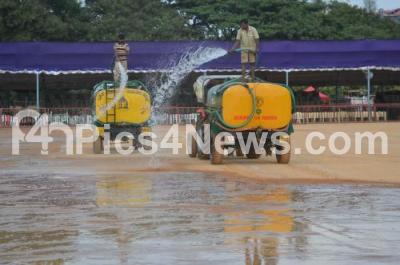 Photo Caption : Water being sprayed to make the dry sand settle down for the upcoming Independence Day Celebration at Manekshaw Parade Grounds, in Bengaluru on Thursday 11th August 2016