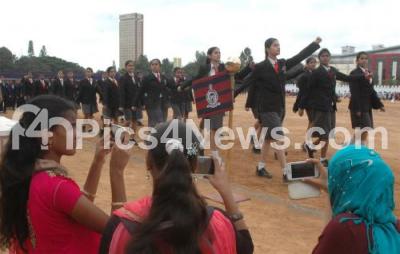 Photo Caption : School students taking part Independence Day rehearsal for the forth coming Independence Day Celebrations at Manekshaw Parade Grounds , in Bengaluru on Friday 12th August 2016