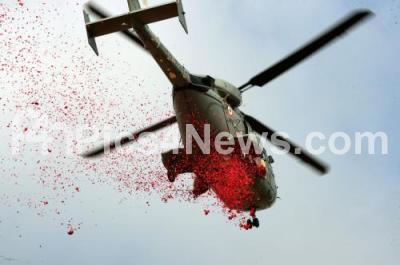 Photo Caption : An helicopter seen spraying flowers on National flag during Independence Day celebrations at Manekshaw Parade Grounds, in Bengaluru on Monday 15th August 2016