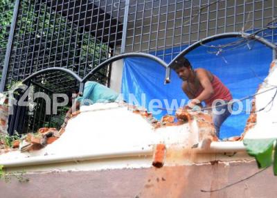 Photo Caption : Owners demolishing by themselves the encroached part of the building, which comes on Rajakaluve at Raja Rajeshwari Nagar , in Bengaluru on Wednesday 17th August 2016