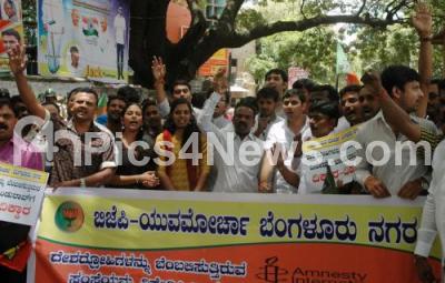 Photo Caption : BJP Yuva Morcha members protest against the delay tactics adopted by the state government in taking action against Amnesty International at Mysore Bank Circle, in Bengaluru on Friday 19th August 2016