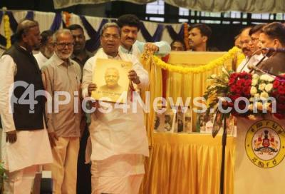 Photo Caption : CM Siddaramaiah with Minister H Anjaneya, Prof Marulasiddaiah and others releasing a book on former CM of Karnataka Devaraj Urs, to mark the 101 Centenary Birthday celebrations at Kanteerva Stadium, organised by Department of Backward Classes, in Bengaluru on Saturday 20th August 2016