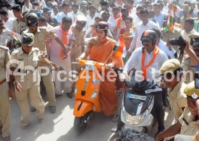 Photo Caption : Union Textiles Minister Smriti Irani flagged off bike rally during the BJP Tiranga Yatra as part of 70th Independence Day celebration at Vidurashwatha, Gowribidanur, on Tuesday 23rd August 2016